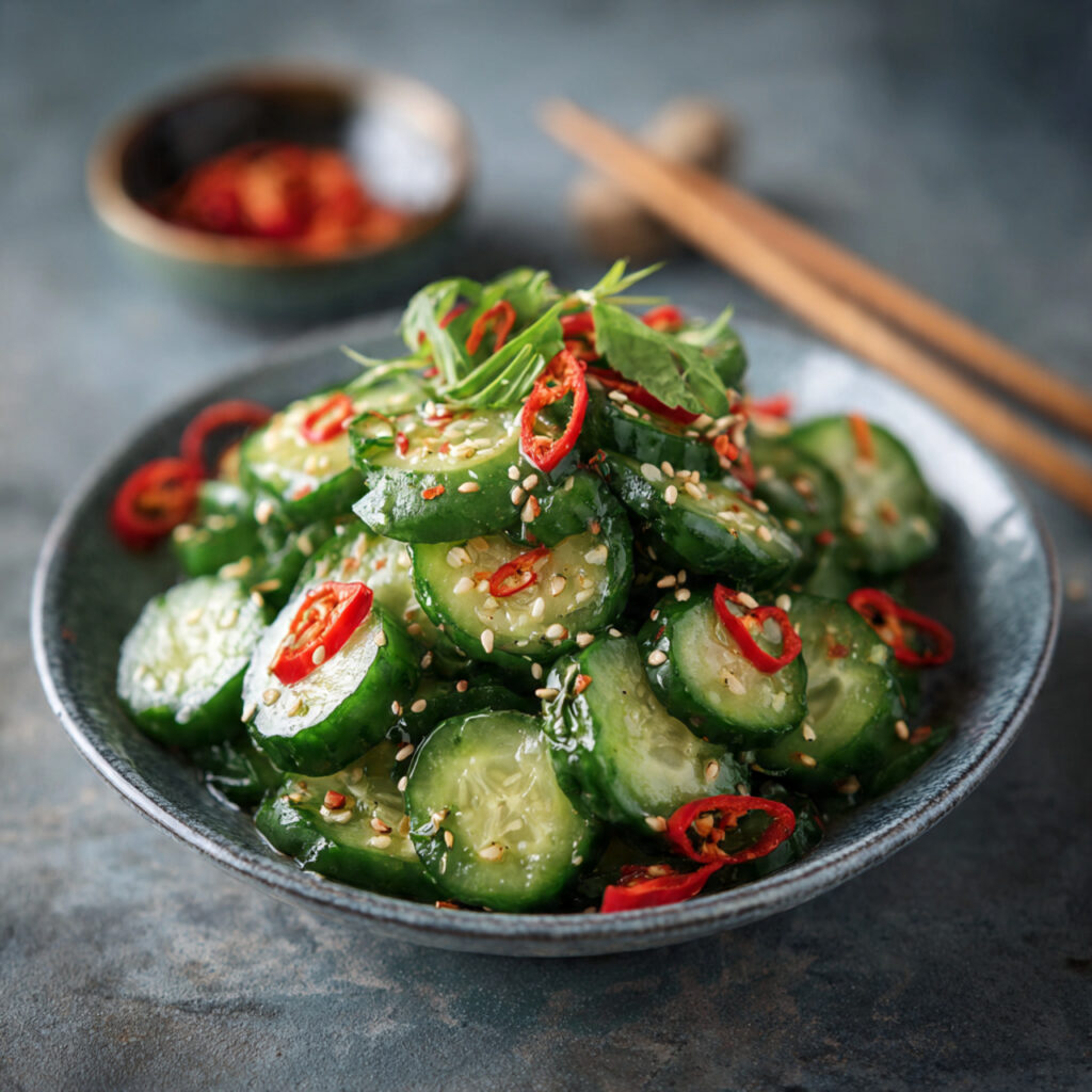 This salad is popular across many Asian-inspired meals because of its refreshing character. It pairs beautifully with grilled meats, stir-fried dishes, rice bowls, and noodle plates. The cucumbers stay crisp while soaking up the dressing, making every bite flavorful and satisfying.