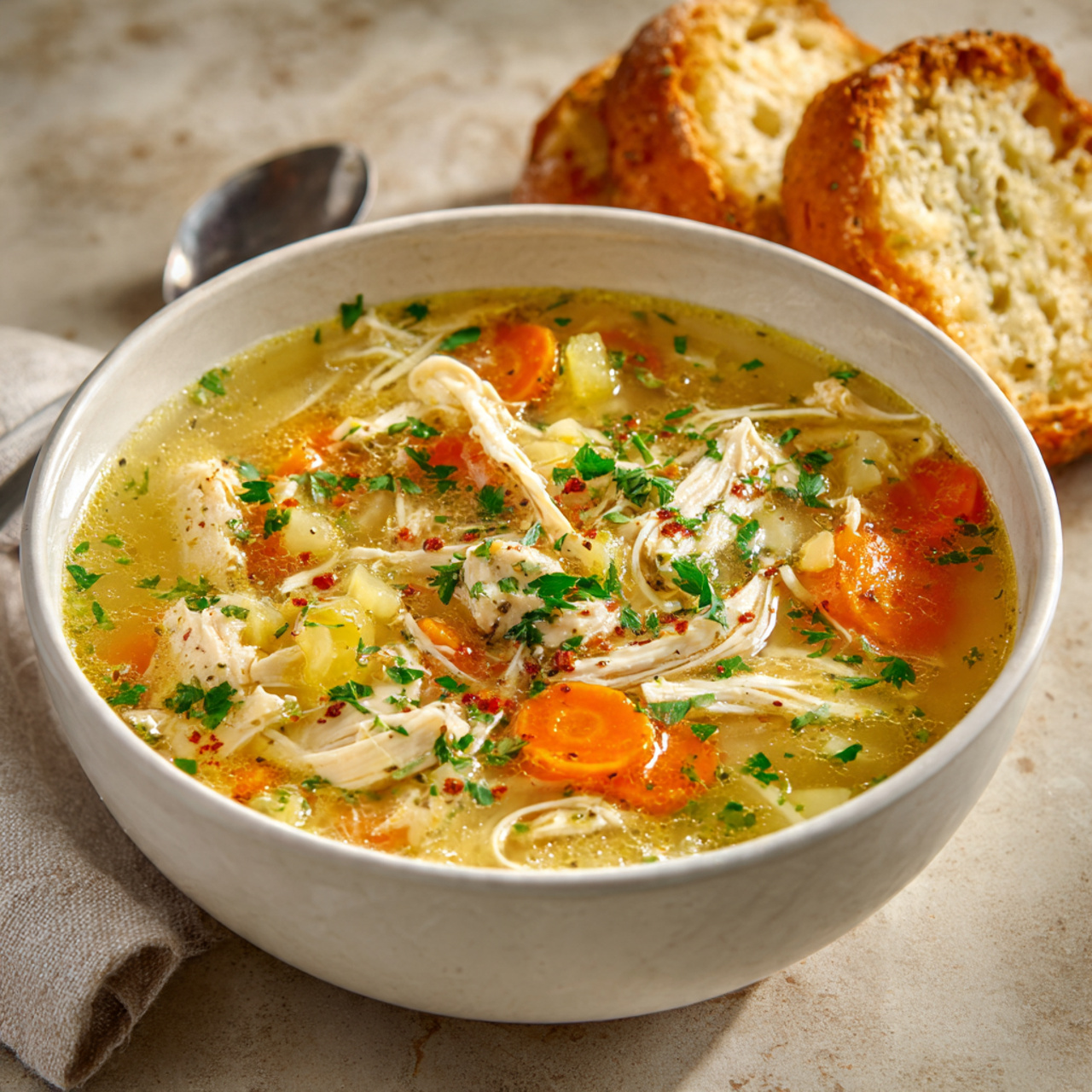 This soup brings together tender chicken, aromatic herbs, and a savory broth that tastes slow-simmered and rich. Every bite feels warm and satisfying.