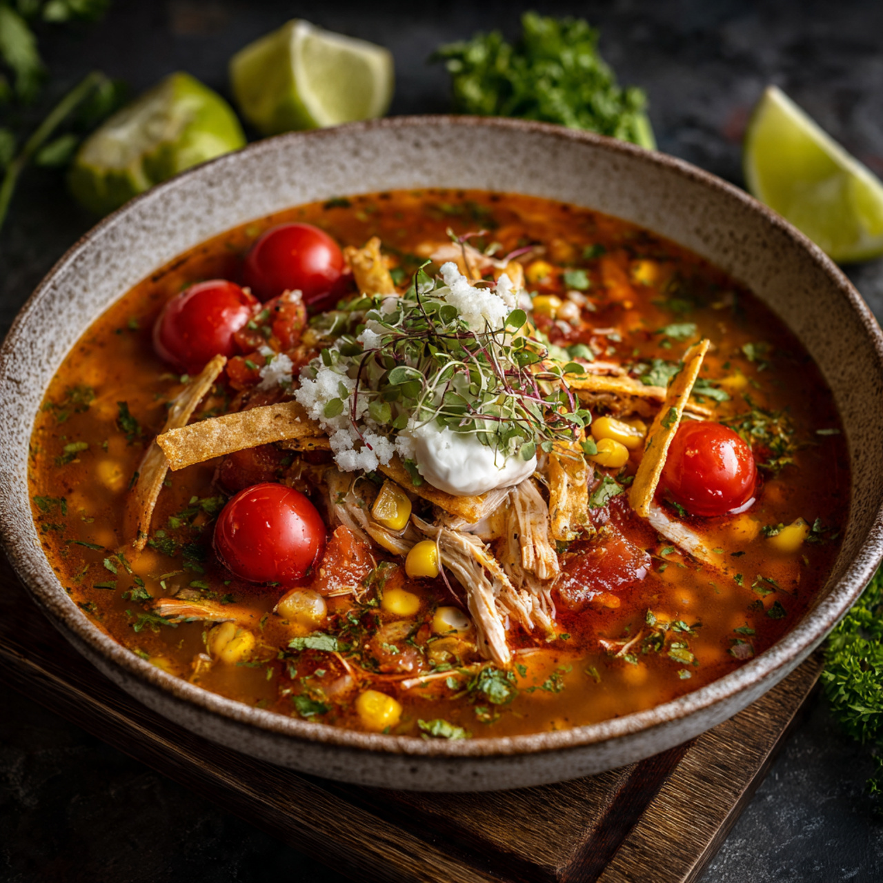 The soup combines savory chicken, tangy tomatoes, smoky spices, and fresh toppings. Each bite feels layered and satisfying without being overwhelming.