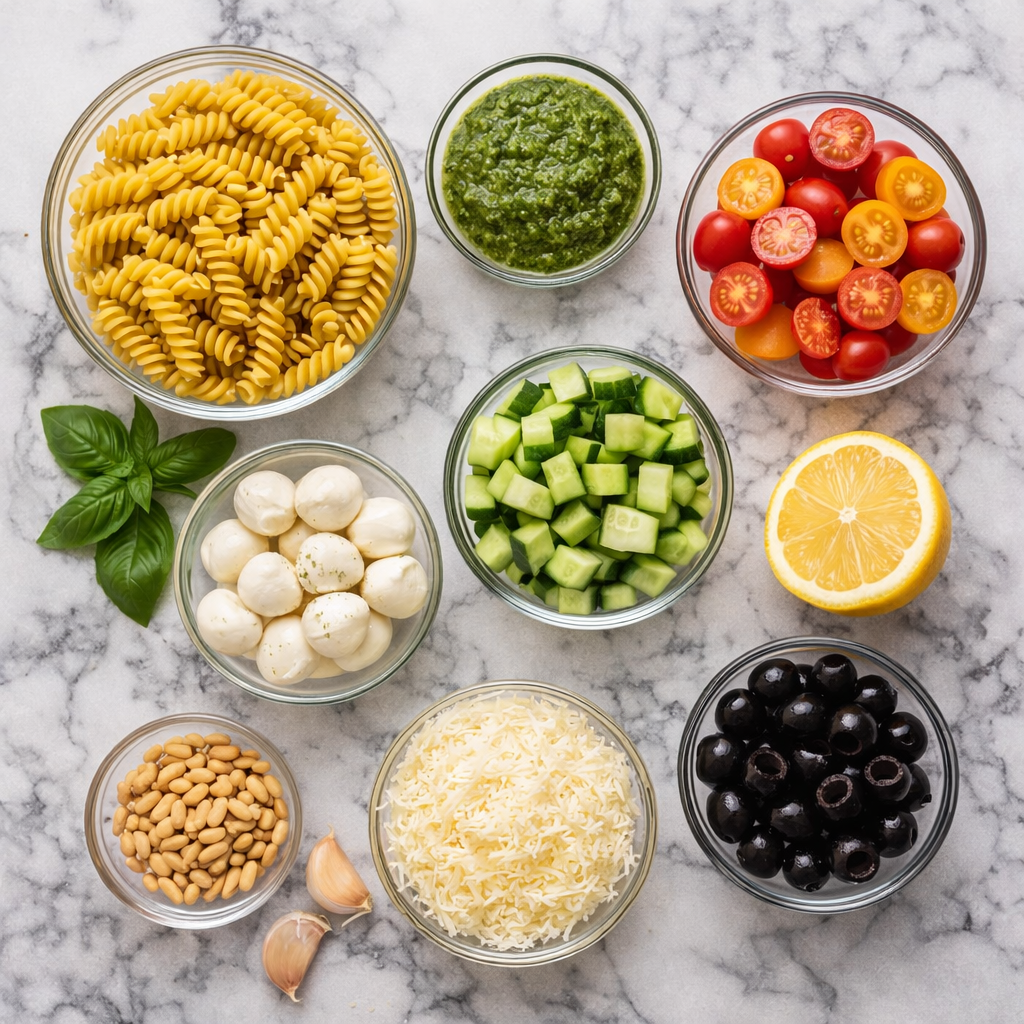 A bowl of pesto pasta salad is proof that simple ingredients can create something truly comforting. The fresh basil aroma, creamy coating, and colorful vegetables bring a sense of warmth and joy to every bite.