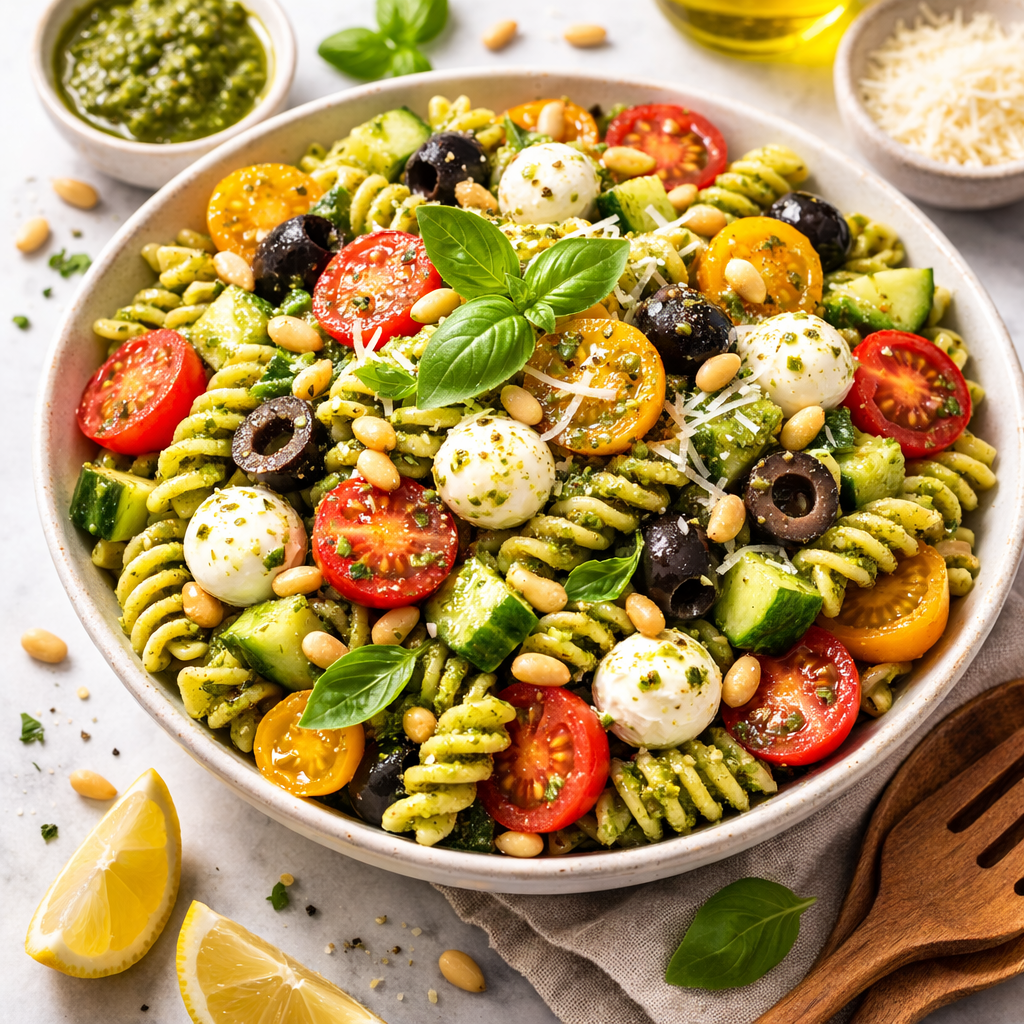 There’s something instantly comforting about a bowl of pesto pasta salad. The moment fresh basil pesto coats tender pasta, the aroma becomes bright, herby, and irresistible. Each bite delivers a creamy texture, pops of juicy tomatoes, and a gentle richness from olive oil and cheese that feels both refreshing and satisfying.