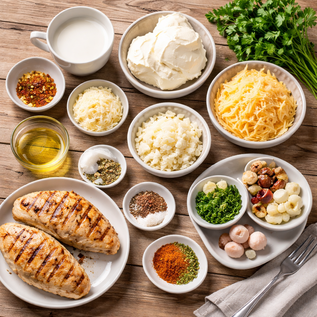 Together, these ingredients create a comforting balance of smoky grilled chicken, creamy sauce, and a golden cheesy topping that melts beautifully.