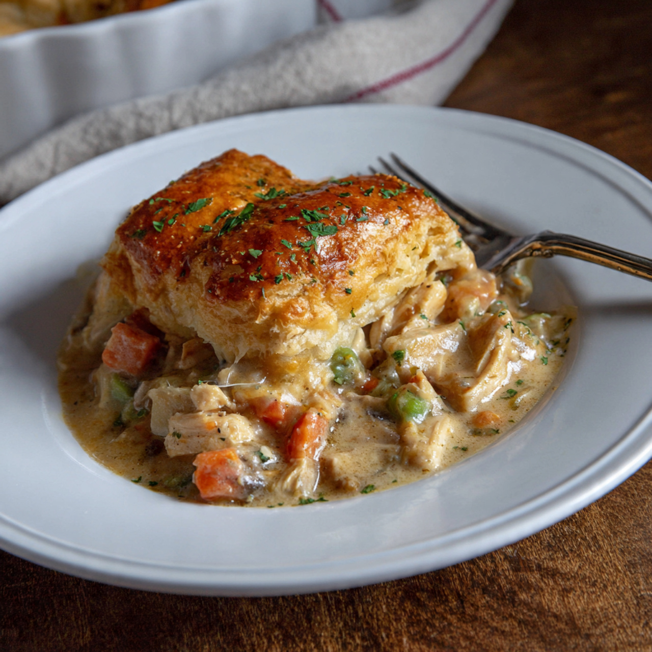 The aroma of savory herbs, roasted chicken, and buttery goodness fills the kitchen while it bakes. Each bite delivers creamy texture, soft vegetables, and a lightly crisp golden top that balances richness with comfort.