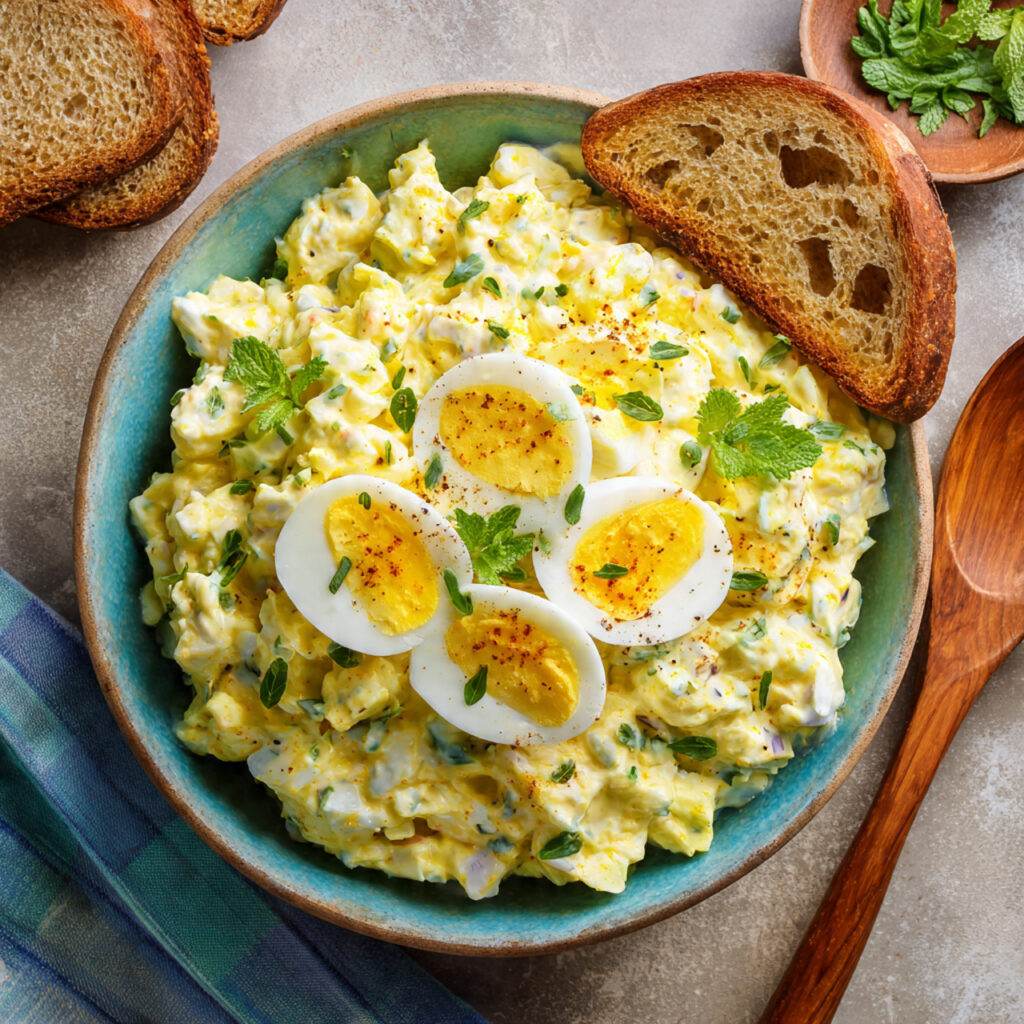 The smooth dressing gently coats the eggs while mustard and lemon add a subtle tang. This balance keeps the salad rich without feeling too heavy.