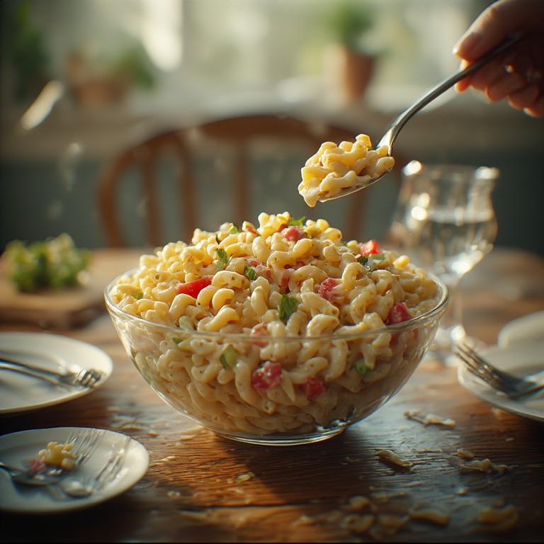 The dressing blends mayonnaise, mild tang, and a hint of sweetness to create a balanced flavor that coats every piece of pasta.