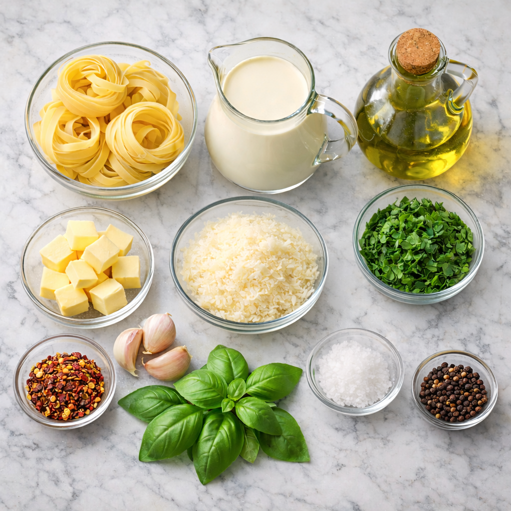 These ingredients combine creamy flavors, aromatic herbs, and crunchy toppings to create a beautifully balanced pasta dish.
