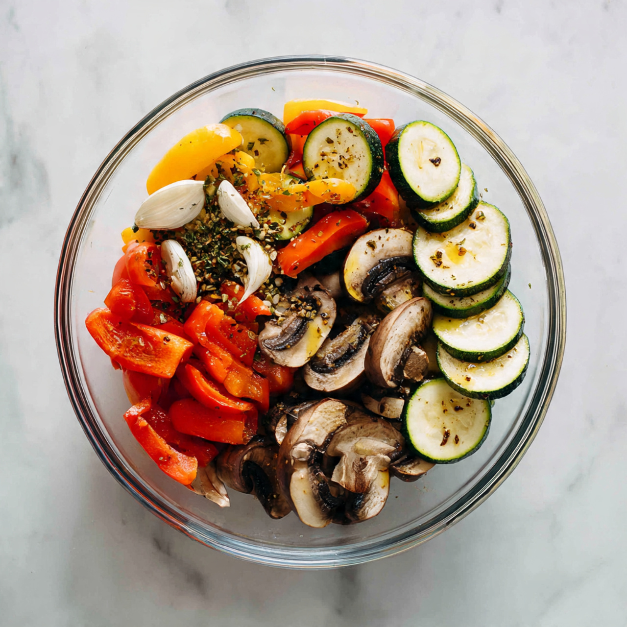 Add the vegetables to the bowl and gently toss until each piece is lightly coated. The vegetables should look glossy but not overly oily.