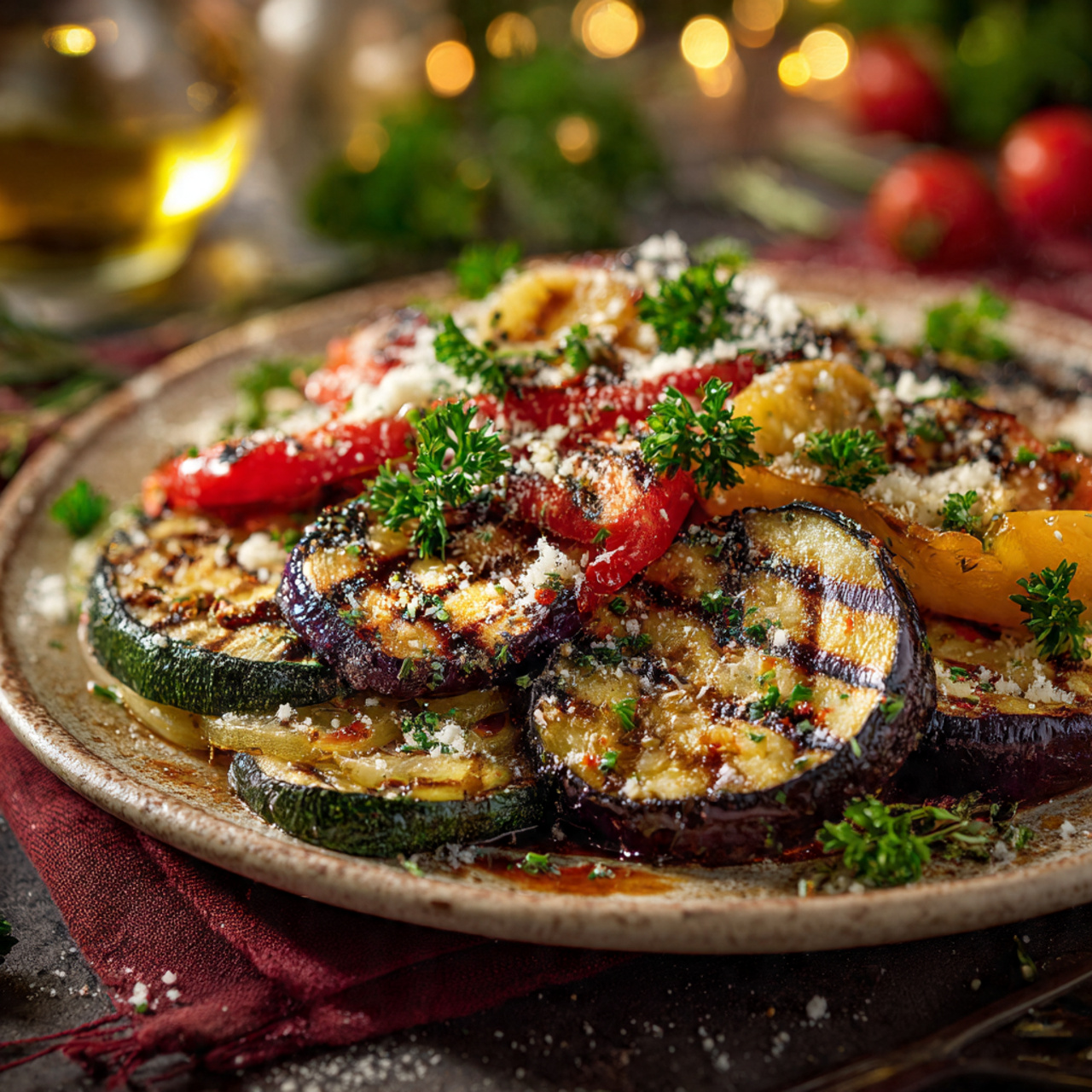 A colorful mix of tender, smoky grilled vegetables tossed with olive oil, garlic, and herbs. This easy recipe makes a perfect side dish for barbecues, weeknight dinners, or potluck gatherings.