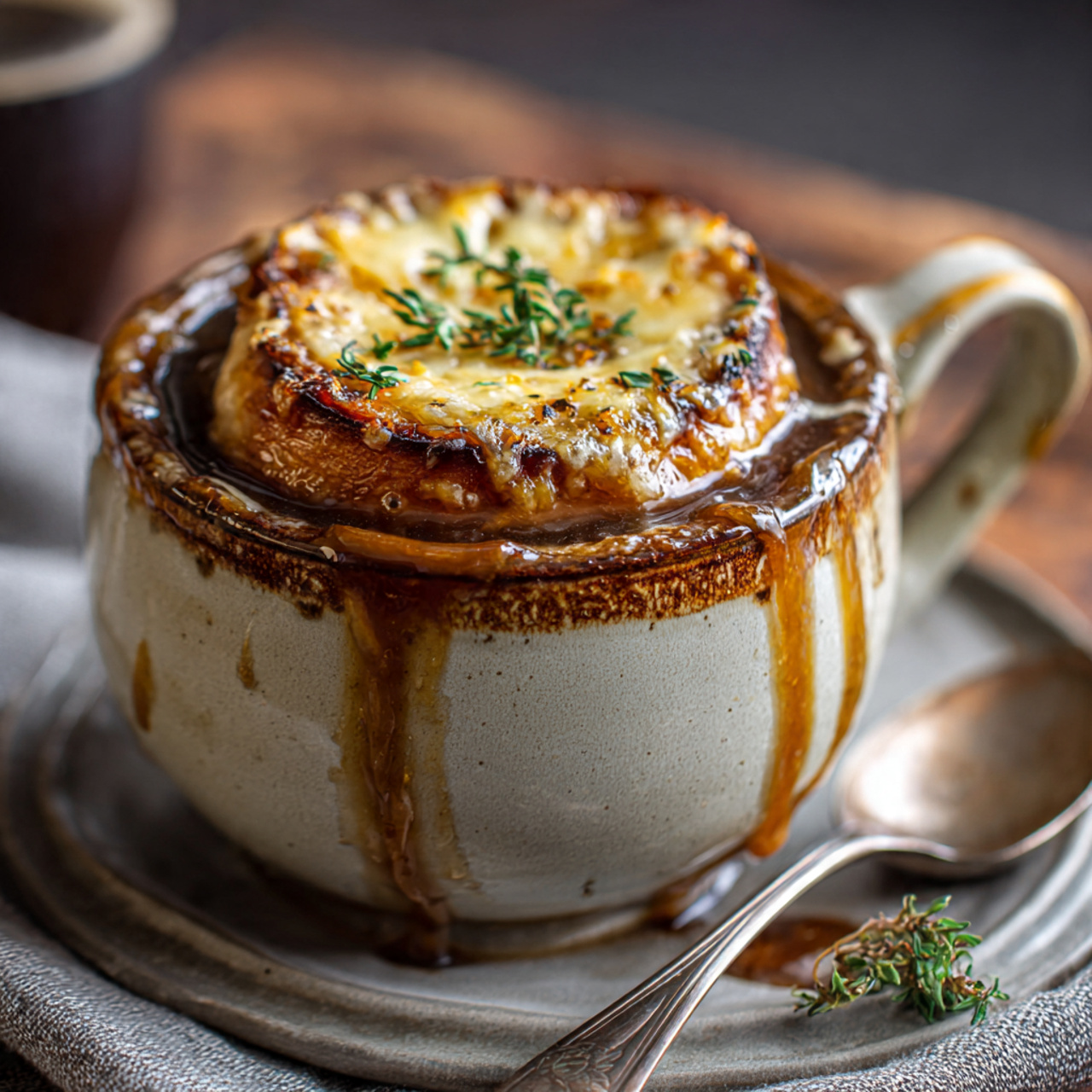 The key to great French onion soup is patience while caramelizing the onions. Cooking them slowly allows their natural sugars to develop, creating that signature sweet, deep flavor.