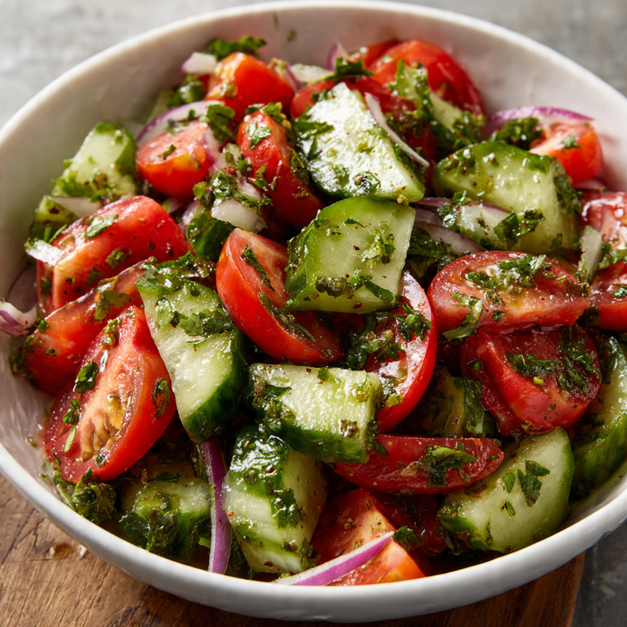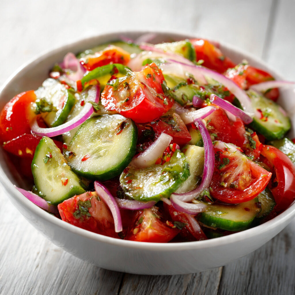 What makes cucumber tomato salad so special is its balance of flavors and textures. The crisp crunch of cucumber, the juicy burst of tomato, and the gentle tang of dressing create a dish that feels both comforting and refreshing at the same time.