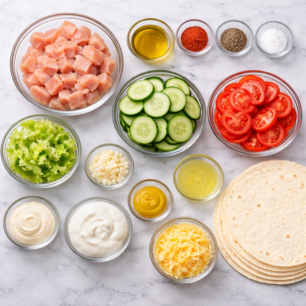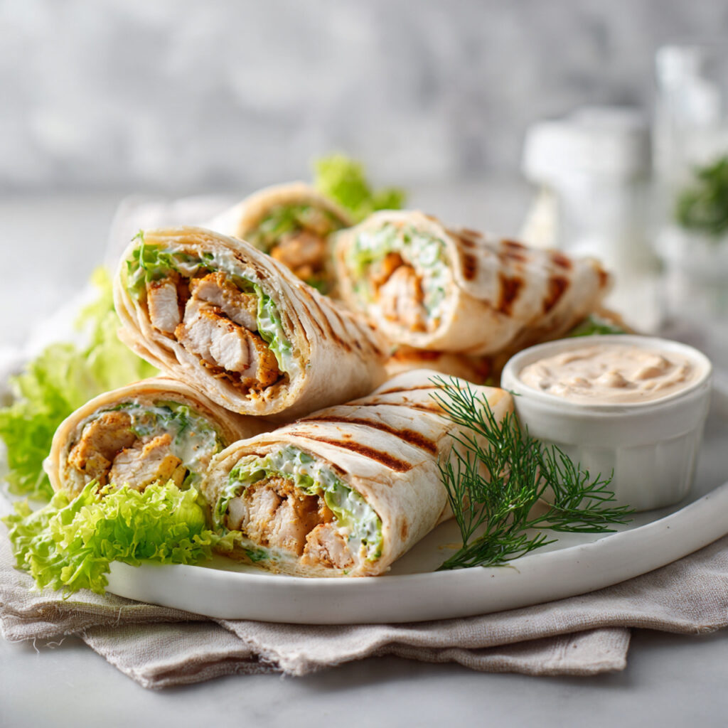- Assemble wraps with sauce, filling, and chicken.