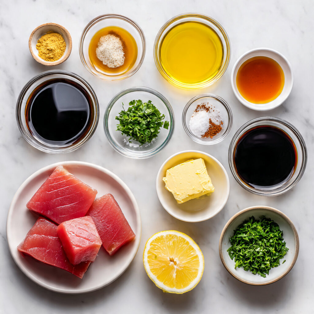 These ingredients work together to create a savory, slightly tangy, and gently sweet flavor profile that enhances the natural richness of the tuna.