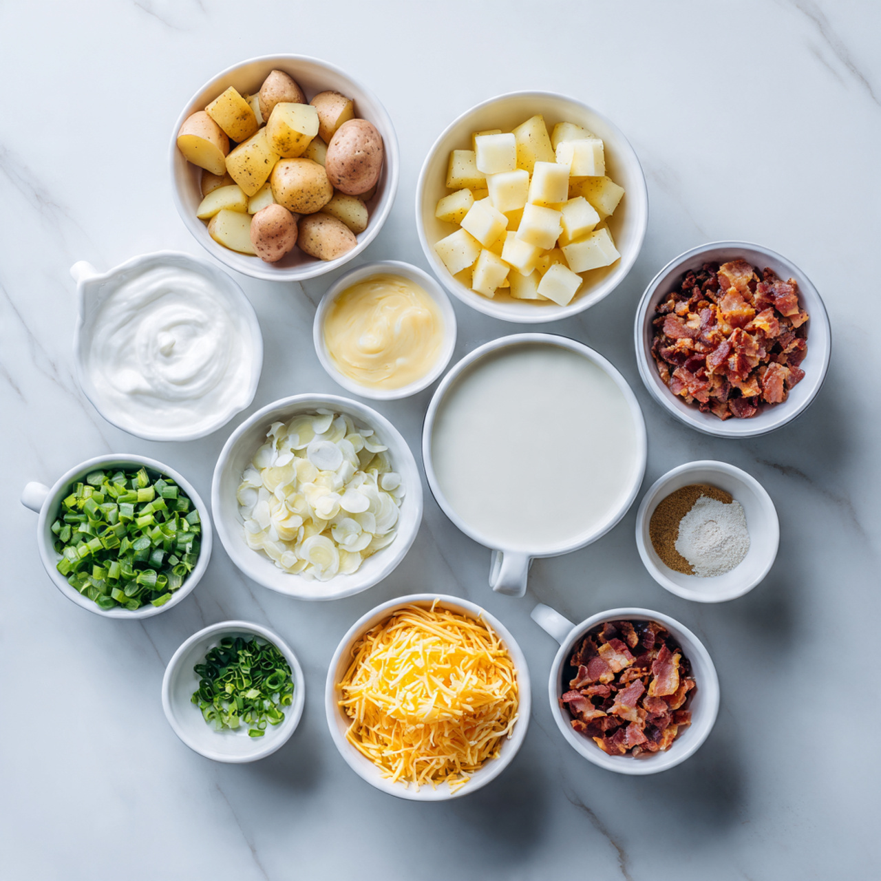 These ingredients combine to create a creamy, savory soup with fluffy potatoes and rich toppings that bring classic baked potato flavors to life.