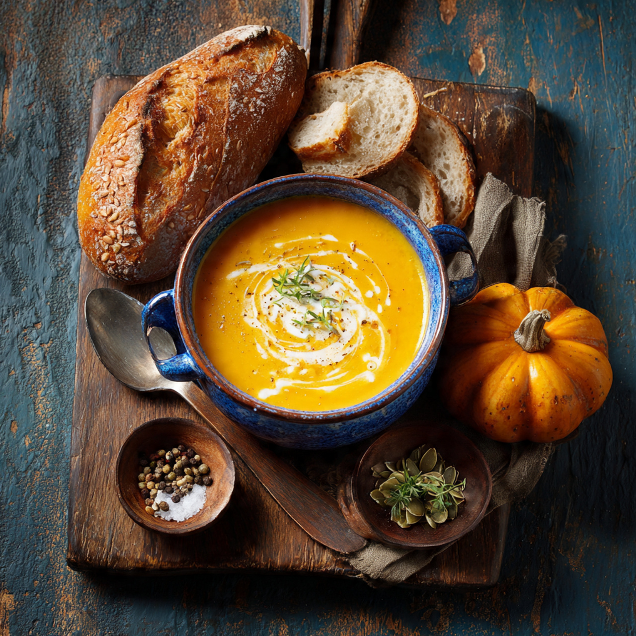 A traditional pumpkin soup enhanced with warm spices for an extra comforting touch.