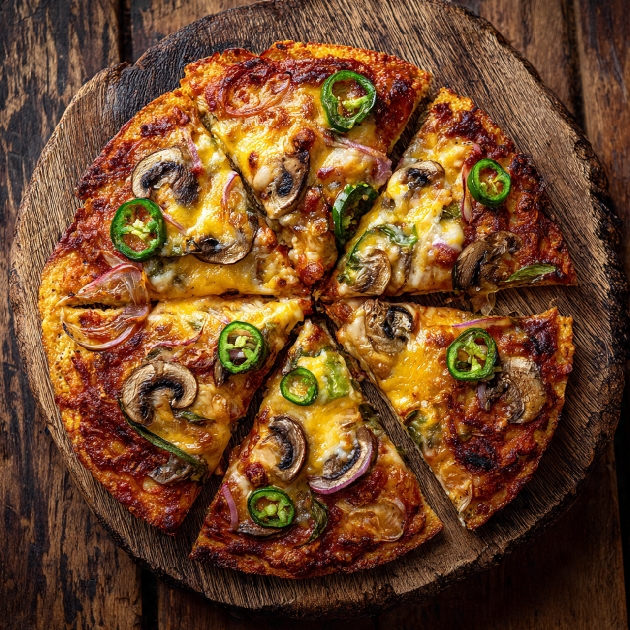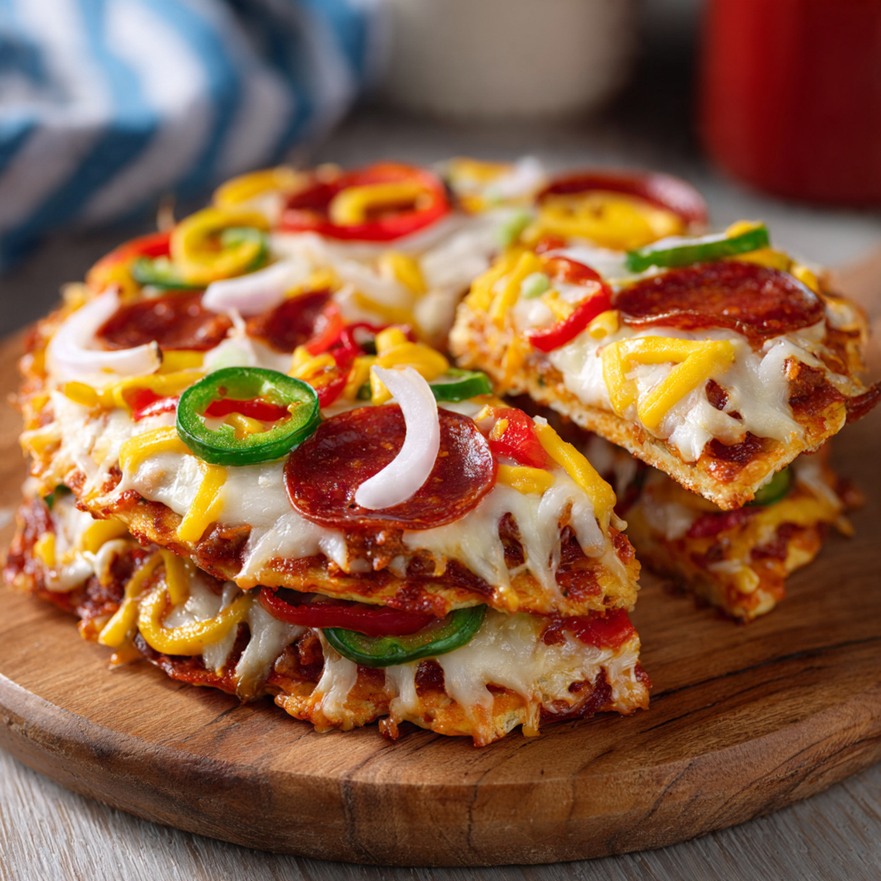 Let the pizza cool for 2–3 minutes so the cheese sets slightly. Slice into wedges and enjoy while warm.