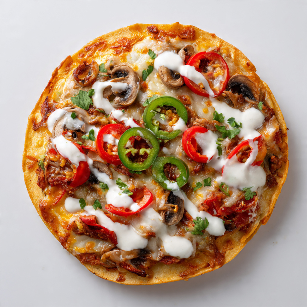 The tortilla bakes into a wonderfully crispy crust while staying thin and light. It gives you that satisfying crunch without the heaviness of traditional dough.