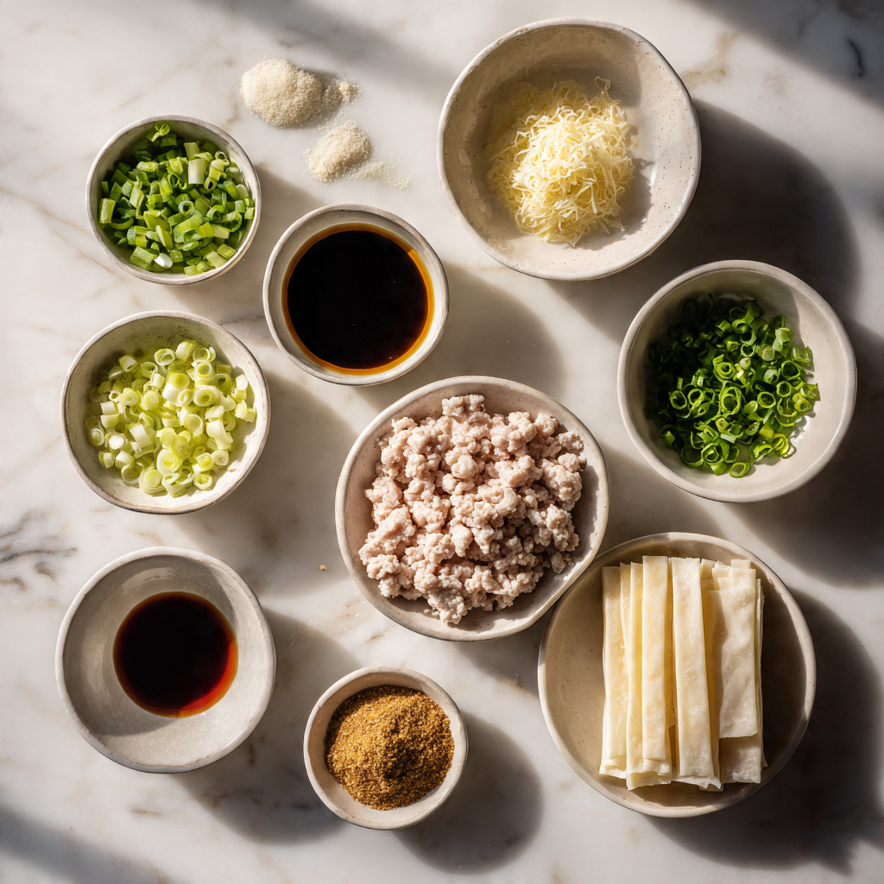 In a bowl, mix ground chicken, green onions, soy sauce, and seasonings until well combined. The mixture should feel slightly sticky but easy to handle.